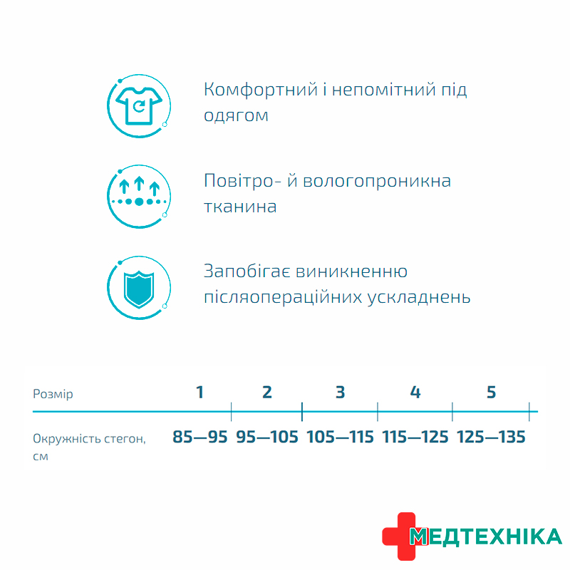 Бандаж виготовлений із сучасних зносостійких матеріалів. Еластичні ремені з липкою стрічкою дозволяють максимально зручно закріпити виріб на тілі. Бавовняні вставки з внутрішнього боку бандажа запобігають виникненню подразнень на шкірі та роблять його більш комфортним. Модель досить тонка, щоб залишатися майже непомітною під одягом.