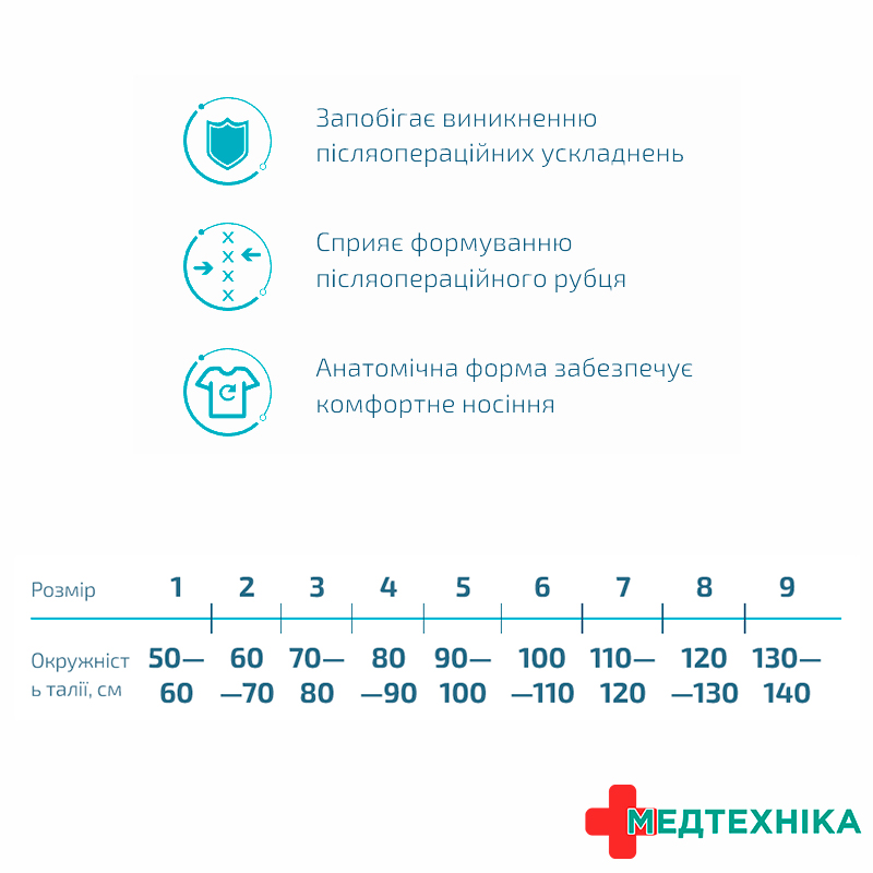 Бандаж забезпечує легкий ступінь фіксації, обережно та надійно підтримує черевну стінку після оперативних втручань і захищає післяопераційний шов від травмування. Створює оптимальні умови для загоєння післяопераційної рани. У разі застосування його у післяпологовому періоді бандаж підтримує живіт, сприяє нормалізації положення органів черевної порожнини, скороченню м’язів матки та підтягненню шкіри живота.