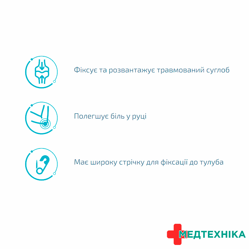 - Знижує больові відчуття завдяки розвантаженню верхньої кінцівки.