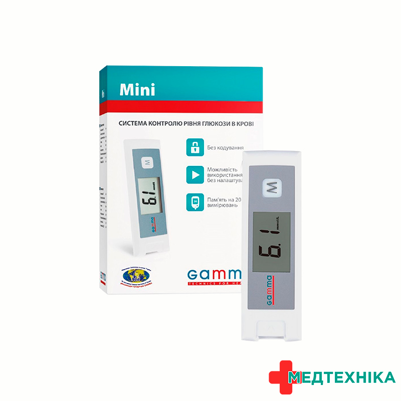 - Глюкометр TM GAMMA MINI оснащений пам’яттю на 20 вимірювань рівня цукру в крові, зі збереженням дати і часу