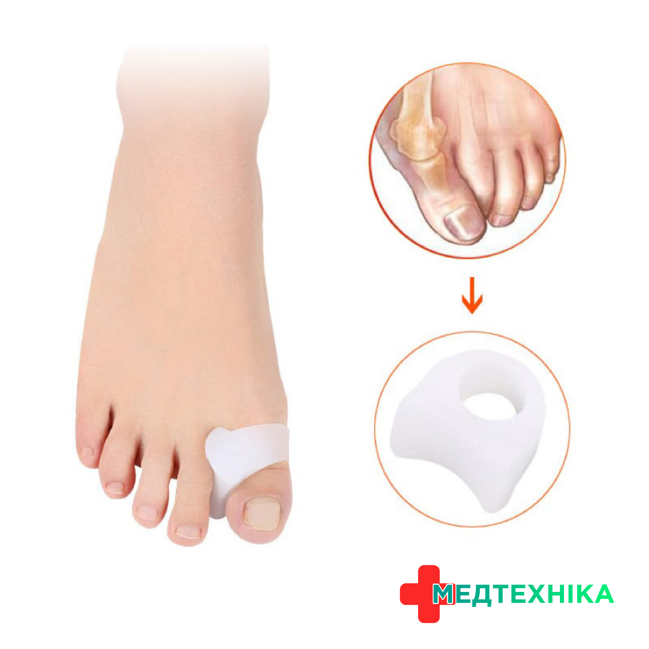 Опис: Виріб виготовлено із гіпоалергенного гелю у формі кільця, для фіксації великого пальця ноги. Використовується для корекції вальгусної деформації великого пальця стопи (Hallux valgus).