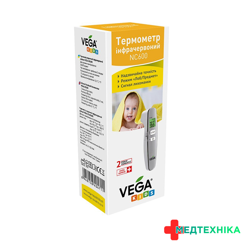 Термометр медичний інфрачервоний лобовий Vega NC 600 призначений для вимірювань та контролю температури людини, забезпечує стабільні показники при кожному вимірі. При включенні прилад виконує автотест, щоб гарантувати точність вимірювань. Термометр пройшов клінічні випробування та був протестований згідно з міжнародними стандартами.